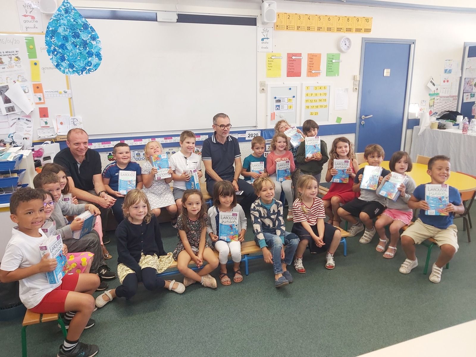 Les élèves et les enseignantes des classes de MS/GS et de CM2 ont eu le plaisir de recevoir la visite de monsieur Lepick Maire de Carnac accompagné par monsieur Houdoy adjoint chargé de l'Education et de la jeunesse . Monsieur le Maire est venu dans notre école pour distribuer des dictionnaires offerts par la mairie de Carnac à chacun des élèves de grande section qui finissent ainsi leur scolarité en maternelle . Puis il a continué en donnant à chaque élève de CM2 une clé USB portant le logo de Carnac qui servira pendant leur scolarité au collège .